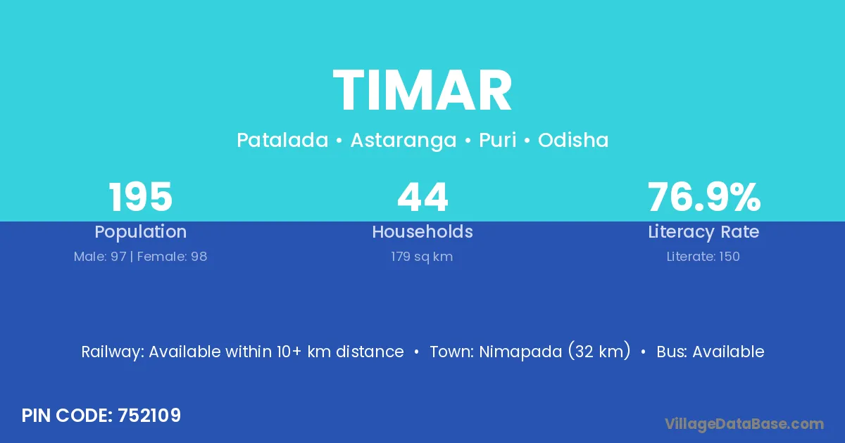 Nimapada (32 km) is the nearest town to Timar village for major economic activities and is located approximately 32 km away.