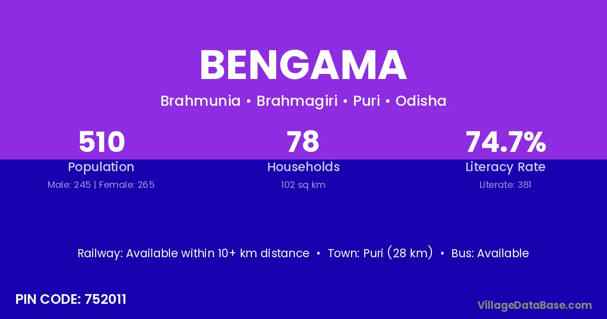Puri (28 km) is the nearest town to Bengama village for major economic activities and is located approximately 28 km away.
