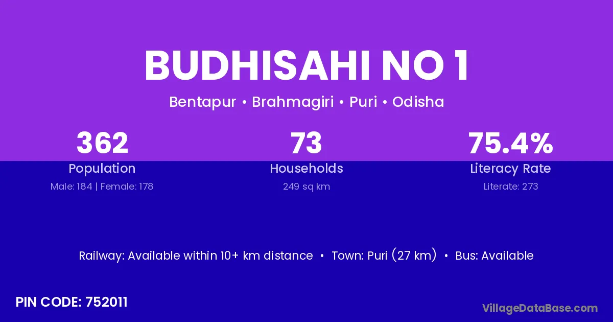 Puri (27 km) is the nearest town to Budhisahi No 1 village for major economic activities and is located approximately 27 km away.