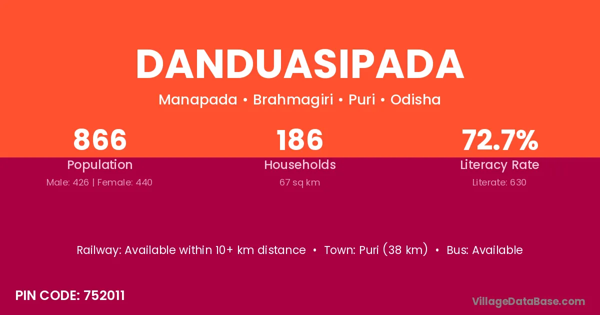 Puri (38 km) is the nearest town to Danduasipada village for major economic activities and is located approximately 38 km away.