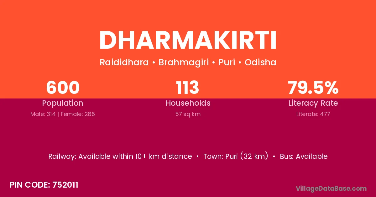 Puri (32 km) is the nearest town to Dharmakirti village for major economic activities and is located approximately 32 km away.
