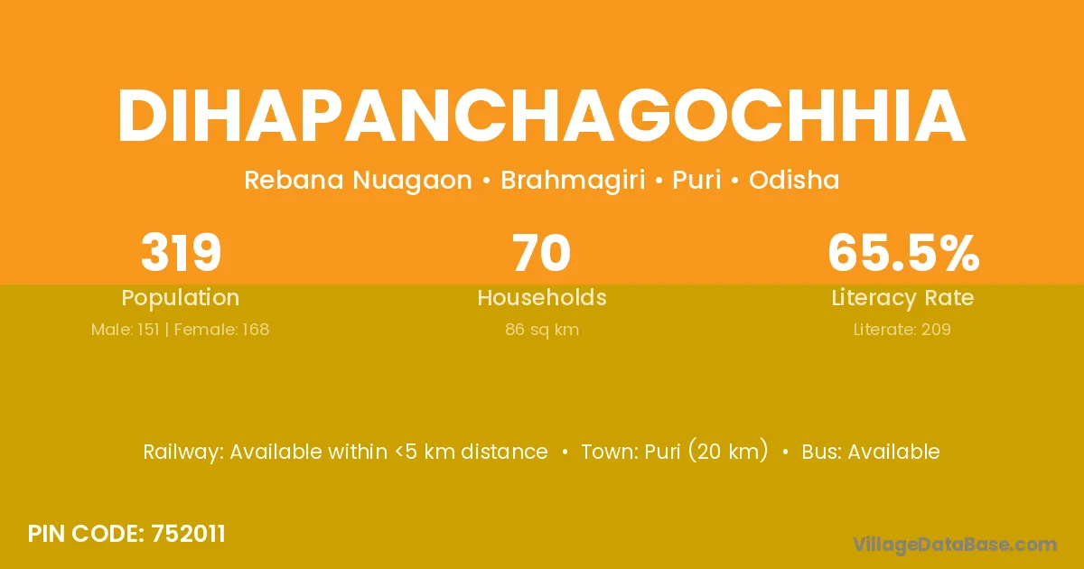 Puri (20 km) is the nearest town to Dihapanchagochhia village for major economic activities and is located approximately 20 km away.