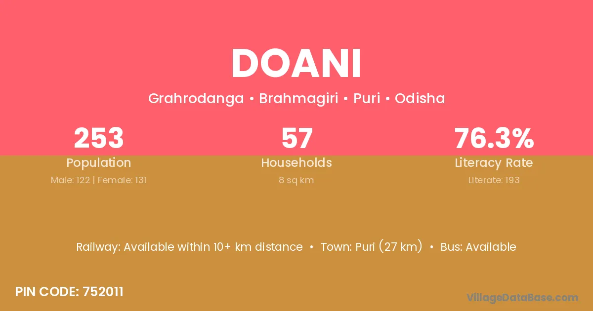 Puri (27 km) is the nearest town to Doani village for major economic activities and is located approximately 27 km away.