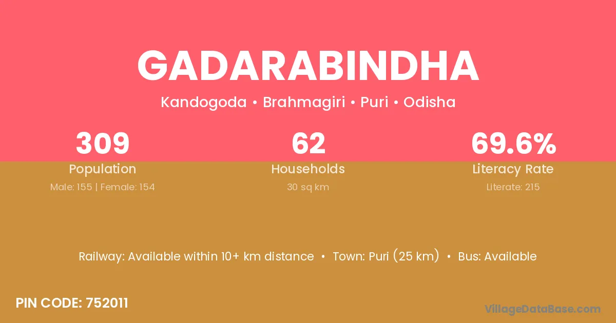 Puri (25 km) is the nearest town to Gadarabindha village for major economic activities and is located approximately 25 km away.