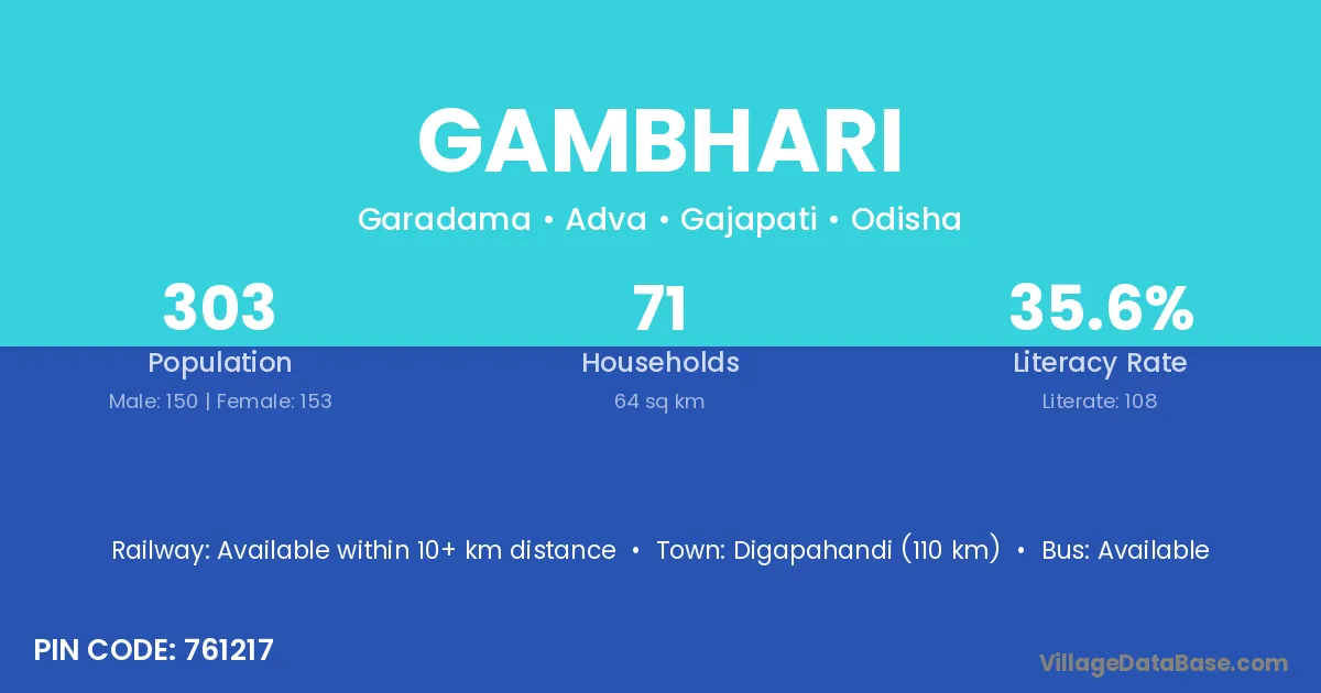 Puri (48 km) is the nearest town to Gambhari village for major economic activities and is located approximately 48 km away.