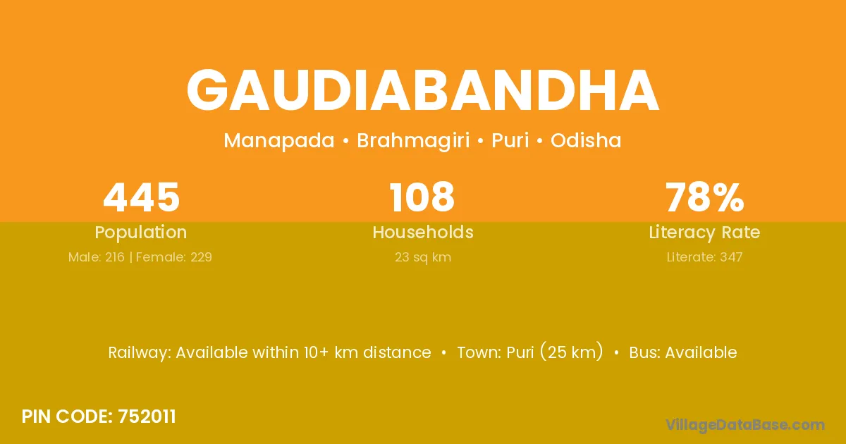 Puri (25 km) is the nearest town to Gaudiabandha village for major economic activities and is located approximately 25 km away.