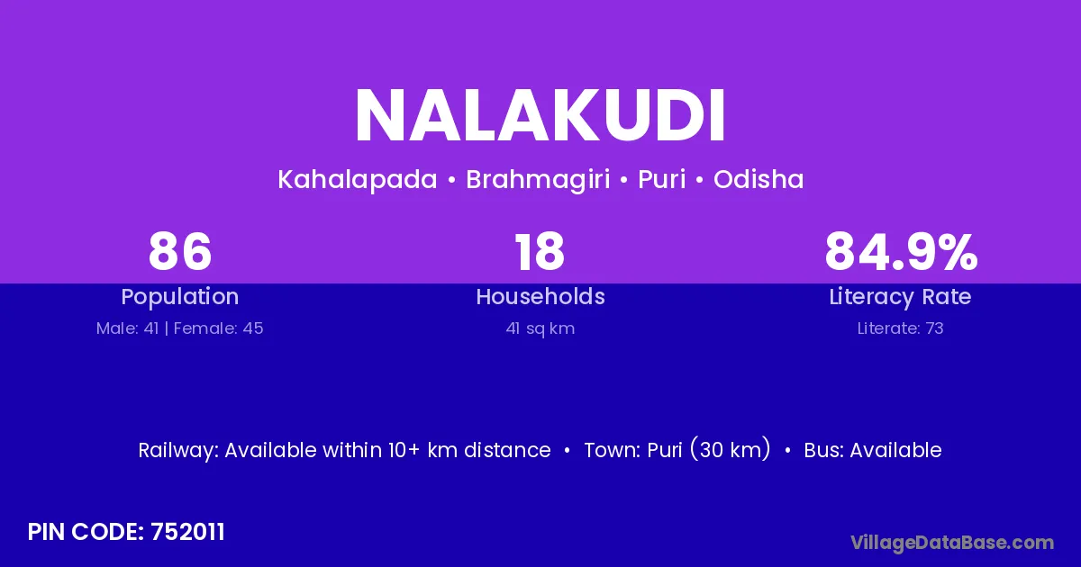 Puri (30 km) is the nearest town to Nalakudi village for major economic activities and is located approximately 30 km away.