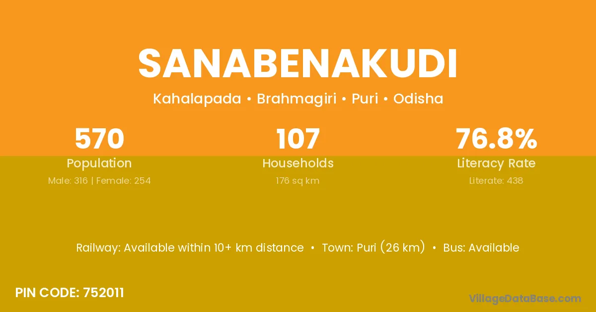 Puri (26 km) is the nearest town to Sanabenakudi village for major economic activities and is located approximately 26 km away.