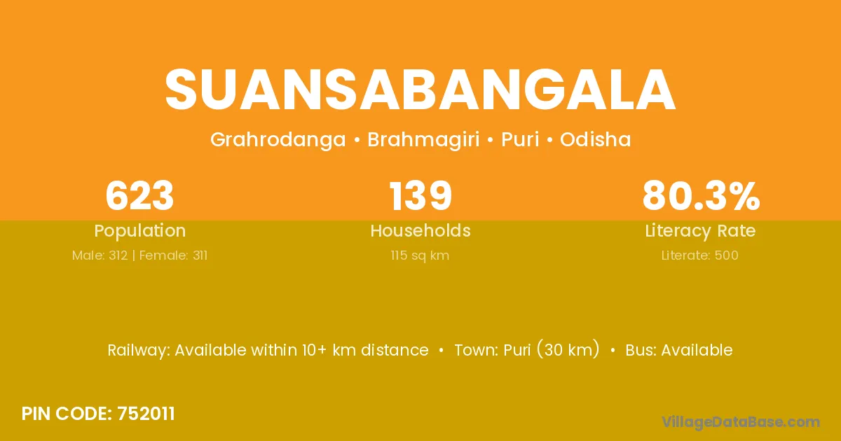 Puri (30 km) is the nearest town to Suansabangala village for major economic activities and is located approximately 30 km away.
