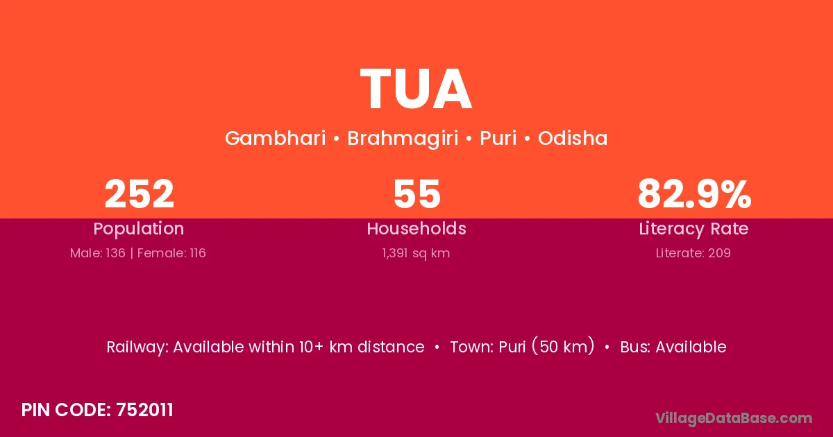 Puri (50 km) is the nearest town to Tua village for major economic activities and is located approximately 50 km away.
