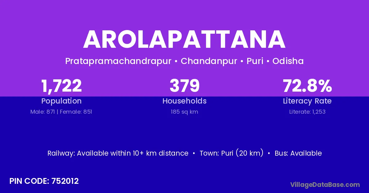 Puri (20 km) is the nearest town to Arolapattana village for major economic activities and is located approximately 20 km away.