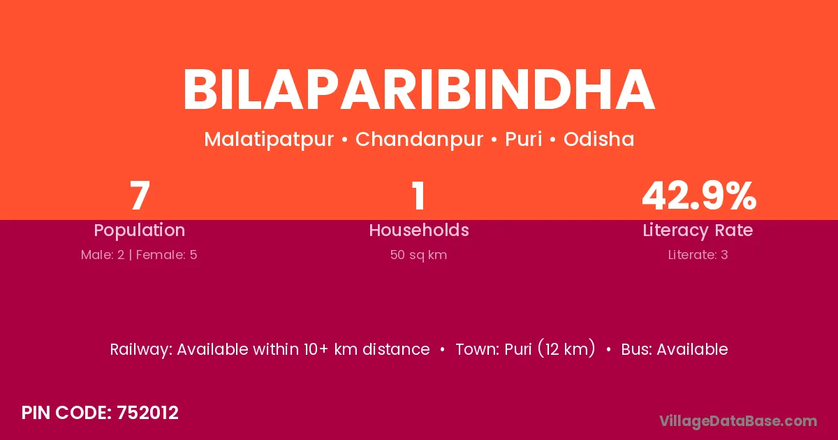 Puri (12 km) is the nearest town to Bilaparibindha village for major economic activities and is located approximately 12 km away.