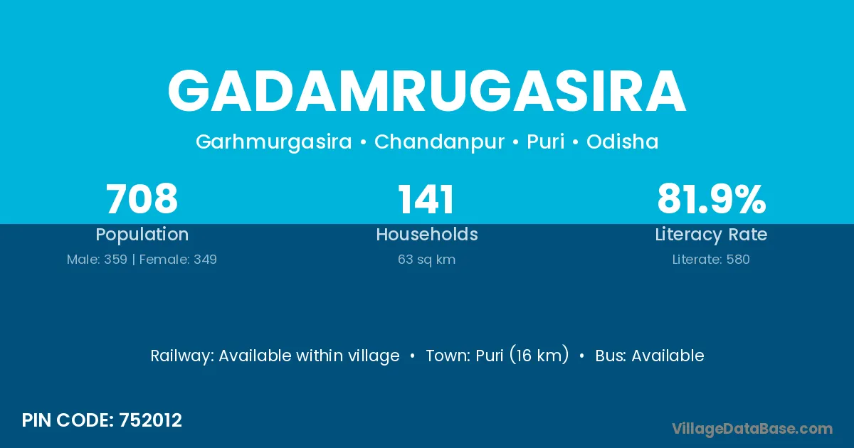 Puri (16 km) is the nearest town to Gadamrugasira village for major economic activities and is located approximately 16 km away.