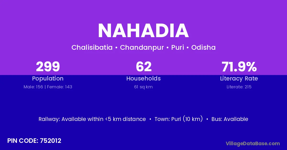 Puri (10 km) is the nearest town to Nahadia village for major economic activities and is located approximately 10 km away.