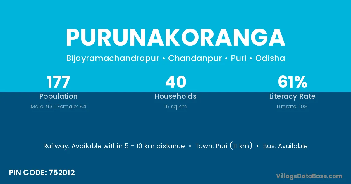 Puri (11 km) is the nearest town to Purunakoranga village for major economic activities and is located approximately 11 km away.