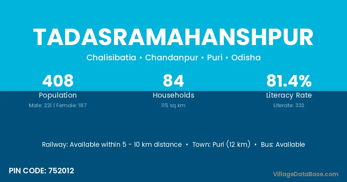 Puri (12 km) is the nearest town to Tadasramahanshpur village for major economic activities and is located approximately 12 km away.