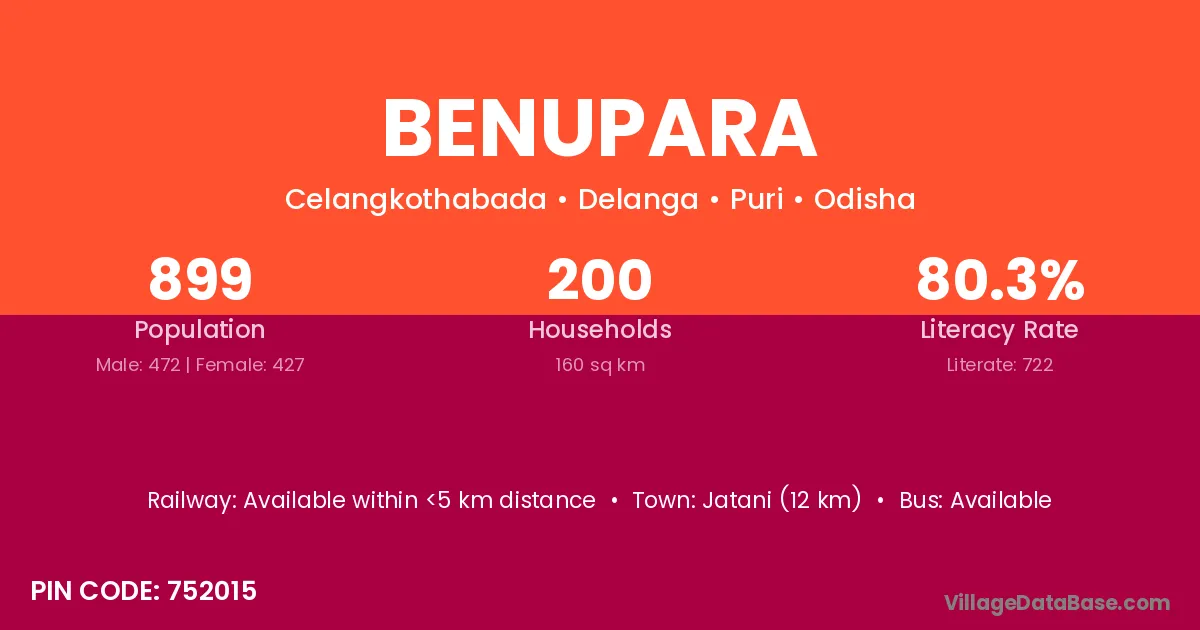 Jatani (12 km) is the nearest town to Benupara village for major economic activities and is located approximately 12 km away.