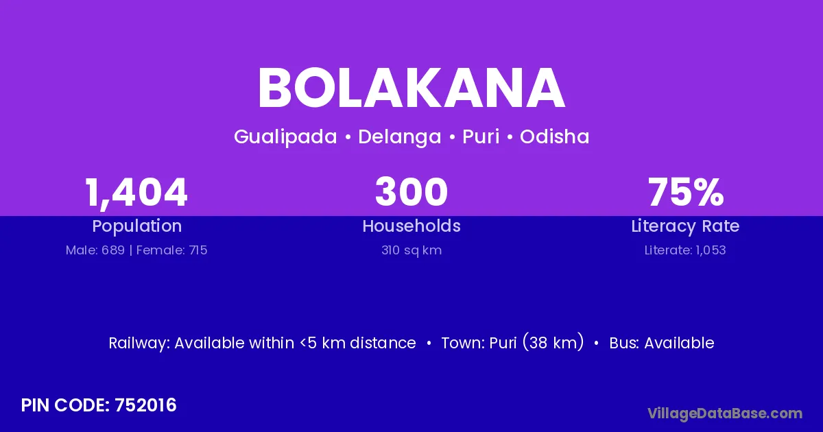 Puri (38 km) is the nearest town to Bolakana village for major economic activities and is located approximately 38 km away.