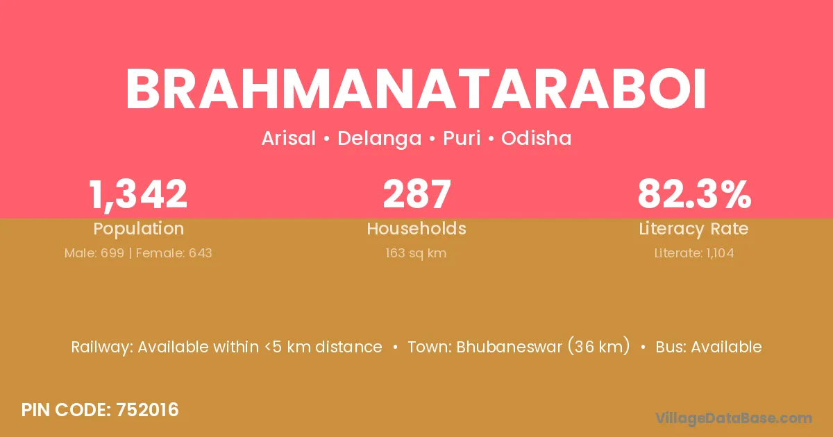 Brahmanataraboi village has a total population of 1,342 people, of which 699 are males and 643 are females.