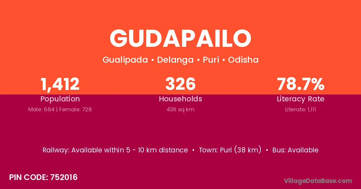 Puri (38 km) is the nearest town to Gudapailo village for major economic activities and is located approximately 38 km away.