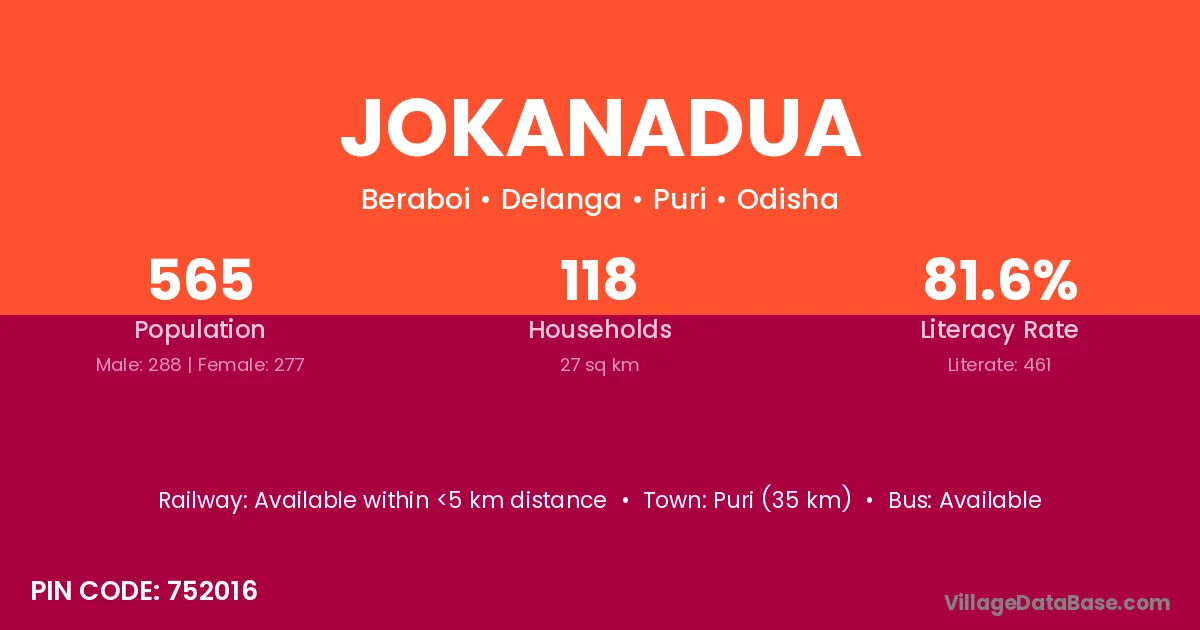 Puri (35 km) is the nearest town to Jokanadua village for major economic activities and is located approximately 35 km away.