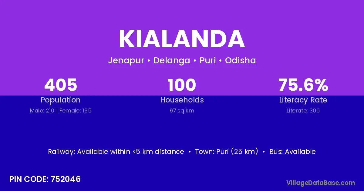 Puri (25 km) is the nearest town to Kialanda village for major economic activities and is located approximately 25 km away.