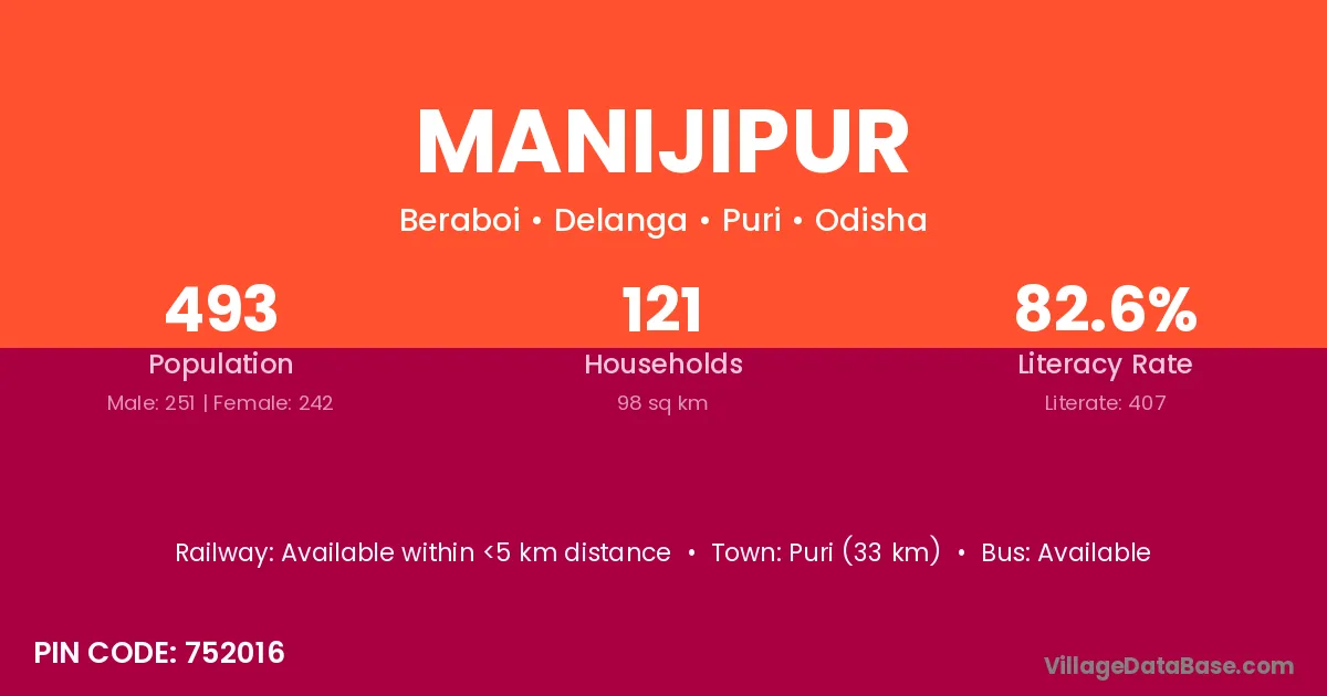 Puri (33 km) is the nearest town to Manijipur village for major economic activities and is located approximately 33 km away.