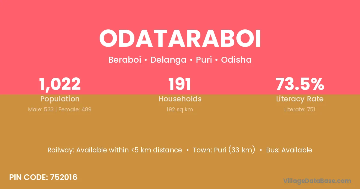 Puri (33 km) is the nearest town to Odataraboi village for major economic activities and is located approximately 33 km away.