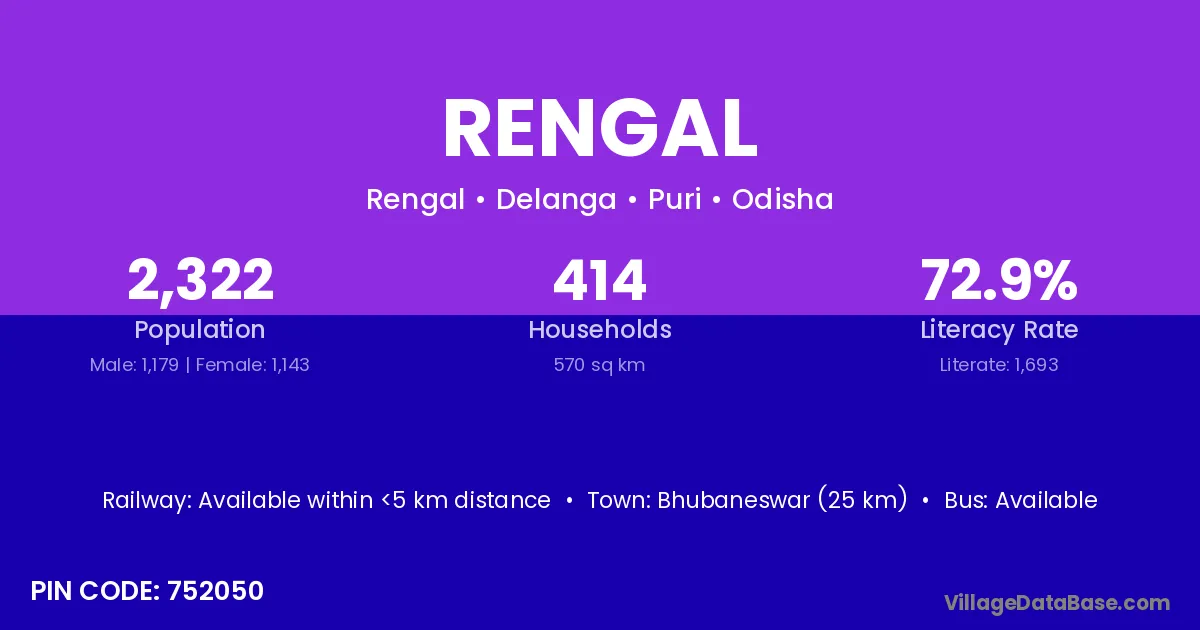 Bhubaneswar (25 km) is the nearest town to Rengal village for major economic activities and is located approximately 25 km away.