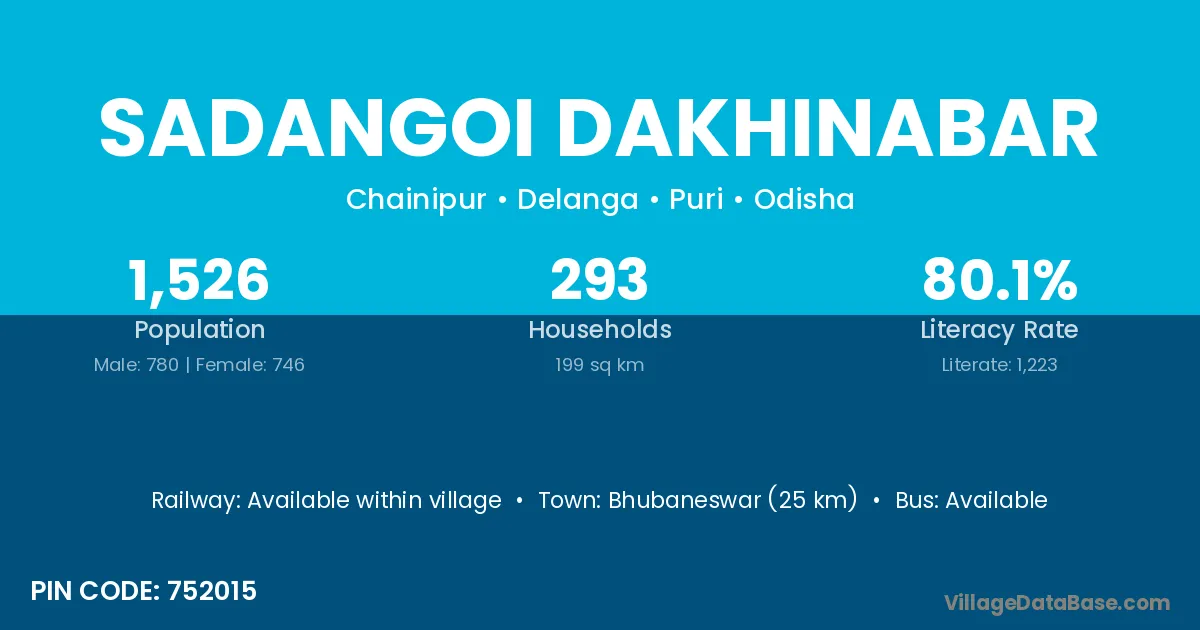 Bhubaneswar (25 km) is the nearest town to Sadangoi Dakhinabar village for major economic activities and is located approximately 25 km away.
