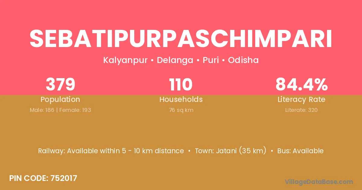 Jatani (35 km) is the nearest town to Sebatipurpaschimpari village for major economic activities and is located approximately 35 km away.