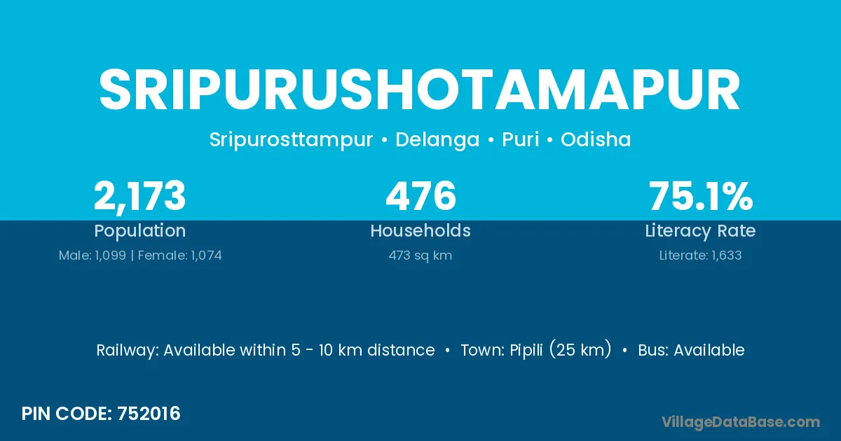 Pipili (25 km) is the nearest town to Sripurushotamapur village for major economic activities and is located approximately 25 km away.