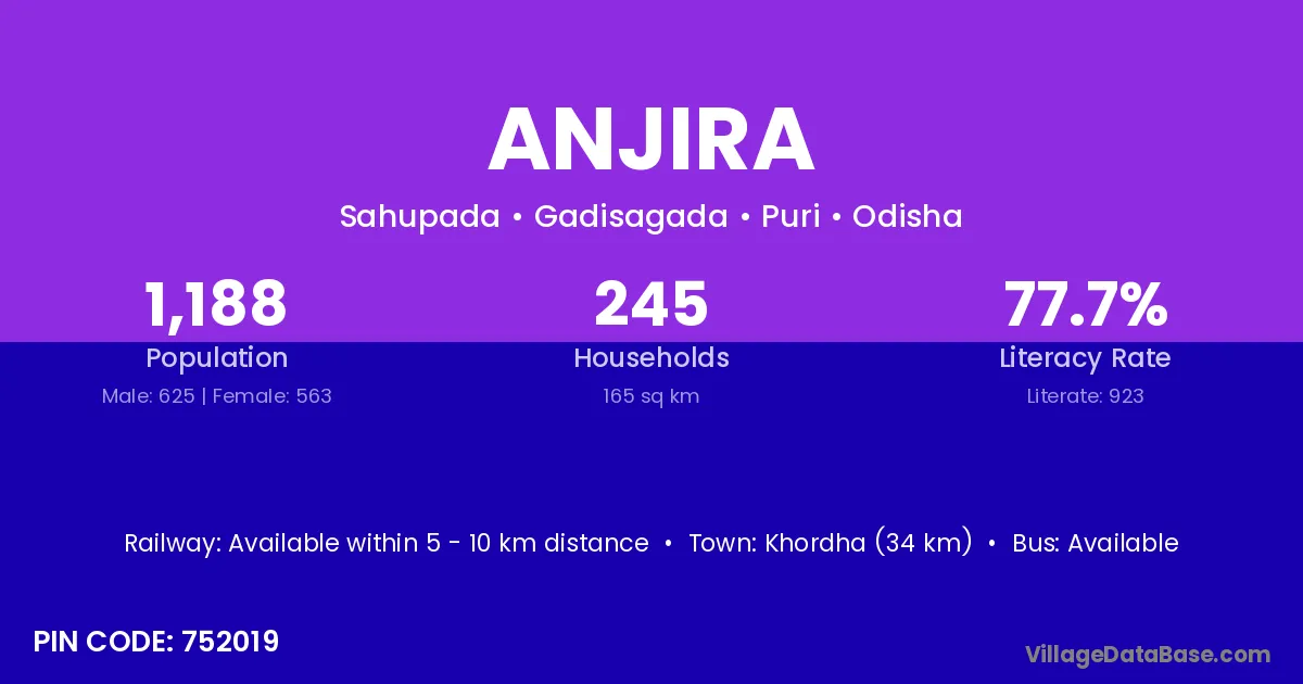 Khordha (34 km) is the nearest town to Anjira village for major economic activities and is located approximately 34 km away.