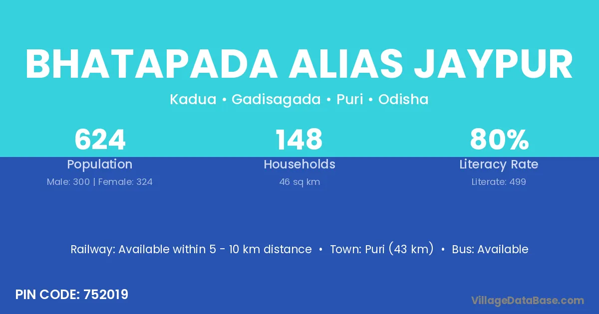 Puri (43 km) is the nearest town to Bhatapada Alias Jaypur village for major economic activities and is located approximately 43 km away.