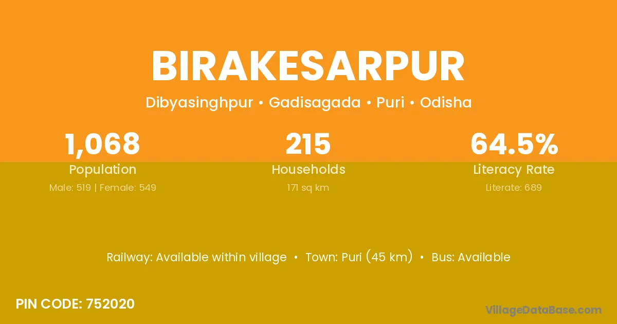 Puri (45 km) is the nearest town to Birakesarpur village for major economic activities and is located approximately 45 km away.