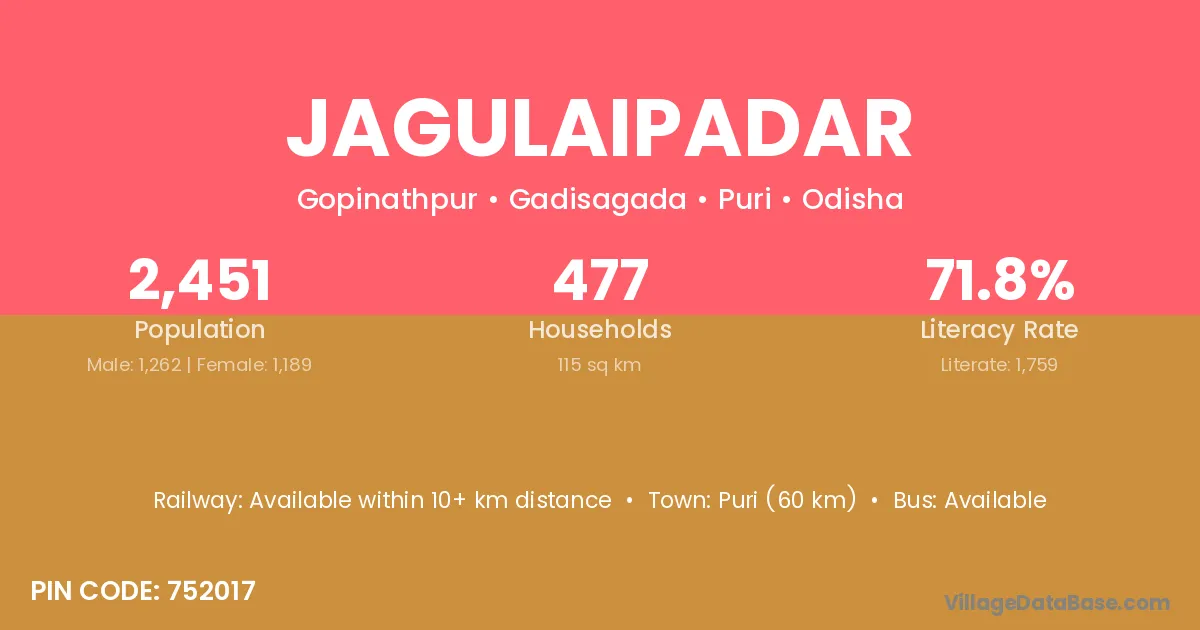 Puri (60 km) is the nearest town to Jagulaipadar village for major economic activities and is located approximately 60 km away.