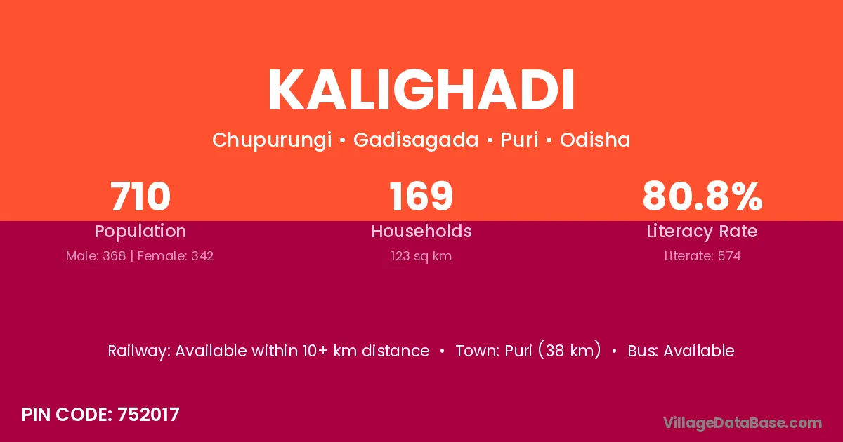 Puri (38 km) is the nearest town to Kalighadi village for major economic activities and is located approximately 38 km away.