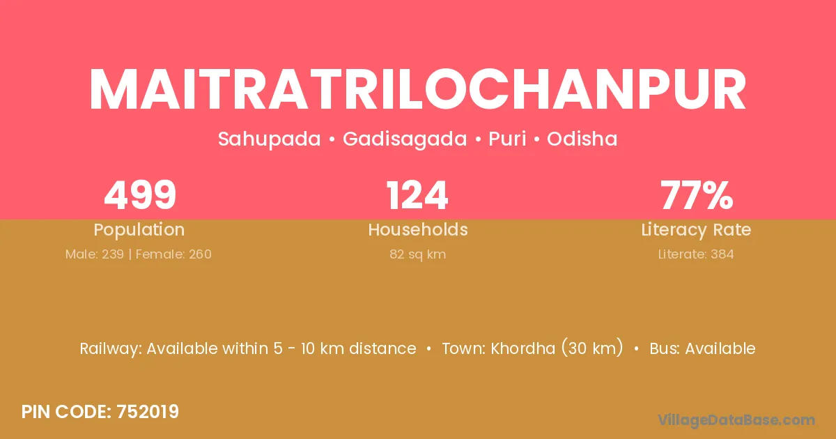 Khordha (30 km) is the nearest town to Maitratrilochanpur village for major economic activities and is located approximately 30 km away.