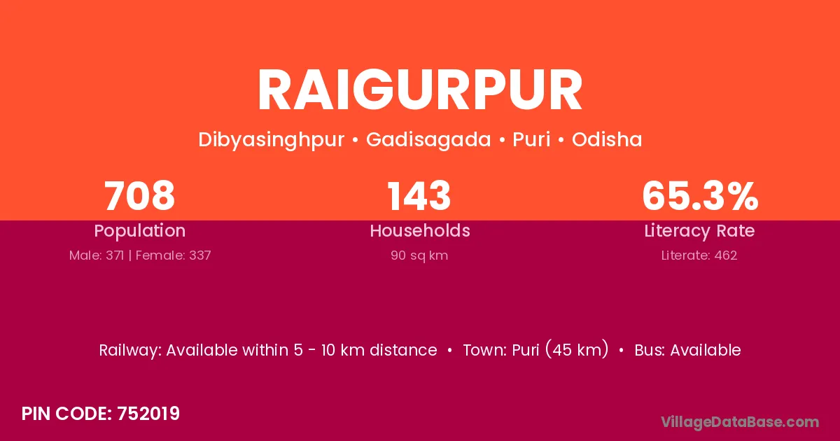 Puri (45 km) is the nearest town to Raigurpur village for major economic activities and is located approximately 45 km away.