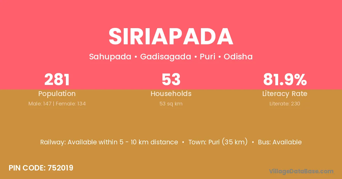 Puri (35 km) is the nearest town to Siriapada village for major economic activities and is located approximately 35 km away.