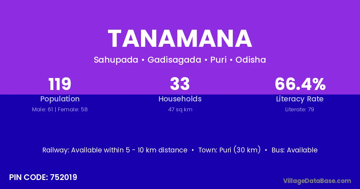 Puri (30 km) is the nearest town to Tanamana village for major economic activities and is located approximately 30 km away.