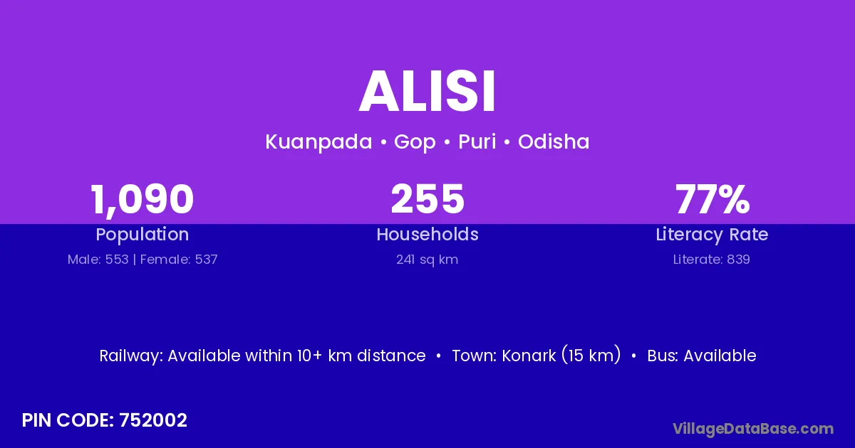 Konark (15 km) is the nearest town to Alisi village for major economic activities and is located approximately 15 km away.