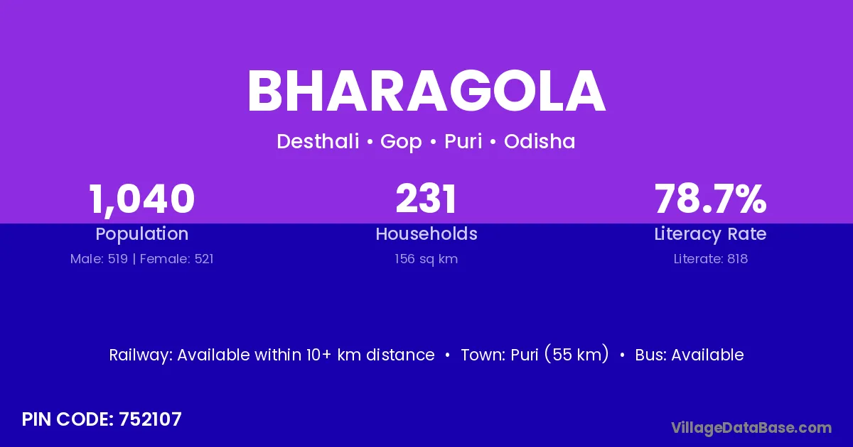 Puri (55 km) is the nearest town to Bharagola village for major economic activities and is located approximately 55 km away.