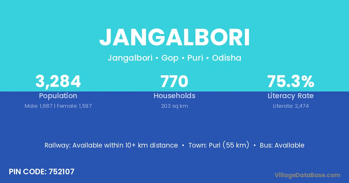 Puri (55 km) is the nearest town to Jangalbori village for major economic activities and is located approximately 55 km away.