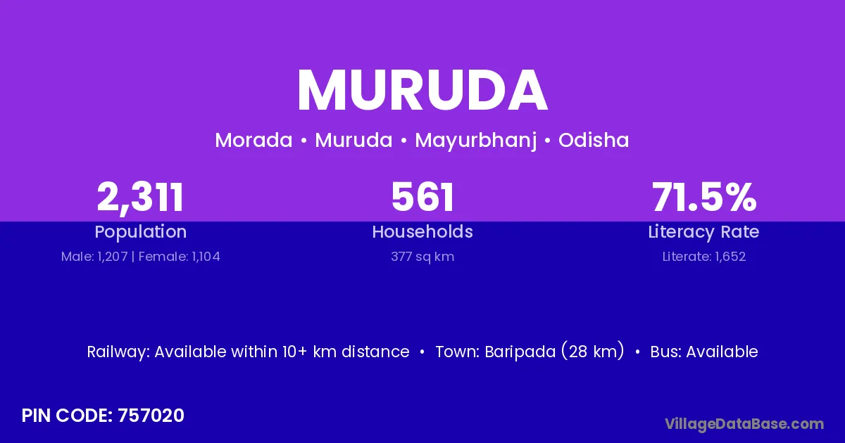 Puri (60 km) is the nearest town to Muruda village for major economic activities and is located approximately 60 km away.