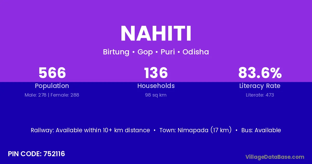 Nimapada (17 km) is the nearest town to Nahiti village for major economic activities and is located approximately 17 km away.