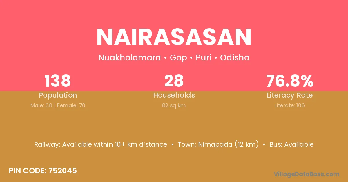 Nairasasan village has a total population of 138 people, of which 68 are males and 70 are females.