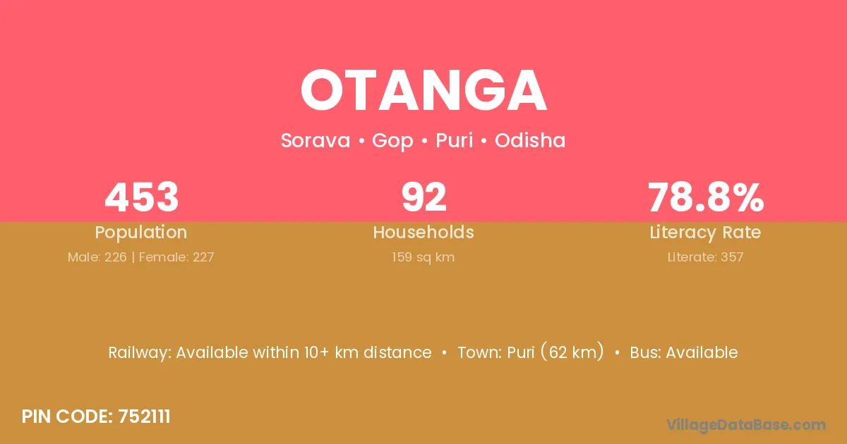 Puri (62 km) is the nearest town to Otanga village for major economic activities and is located approximately 62 km away.