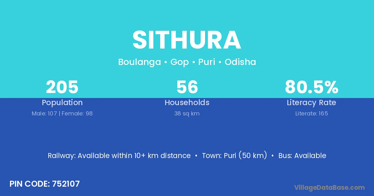Puri (50 km) is the nearest town to Sithura village for major economic activities and is located approximately 50 km away.