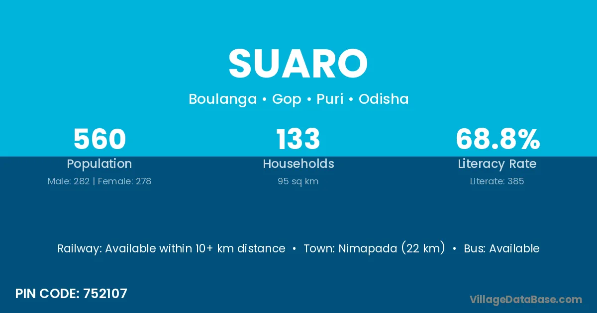 Nimapada (22 km) is the nearest town to Suaro village for major economic activities and is located approximately 22 km away.